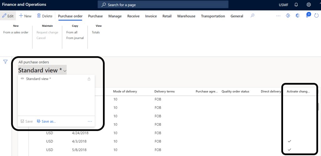 In this example I have added “Activate change management” field to the purchase orders grid, then saved the view: