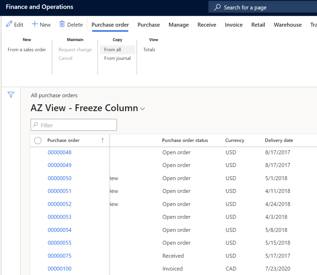 This feature allows you to select a column to display rows grouped by the selected column, in the example below I selected to group purchase orders by Vendor account: