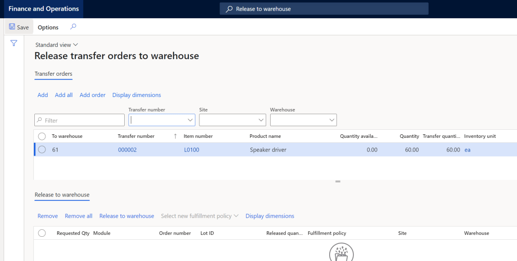 Warehouse management > Release to warehouse > Release transfer orders to warehouse