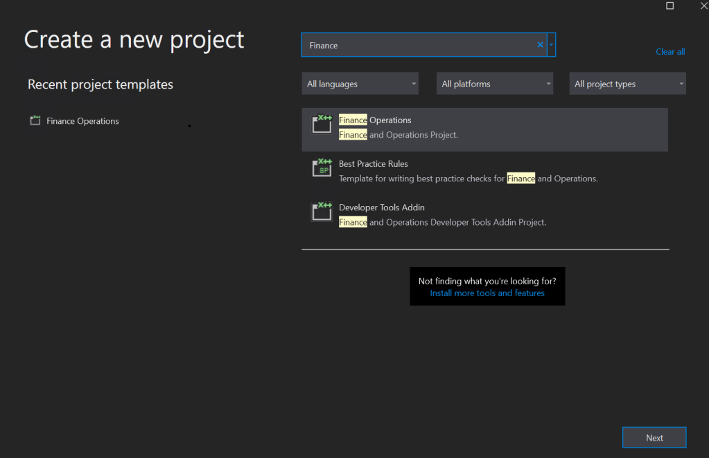 Create new project in Visual 2019 the create new project dialog has changed, ensure to enter Finance keyword to find the right project template.