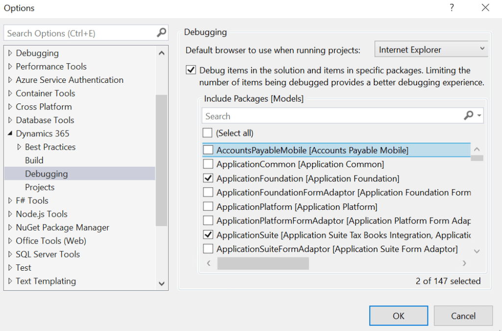 Visual Studio 2019 Debugging Options for D365 Dev Environment In VS 2019, to debug D365 code you will need to have the correct settings which can be found under: Extensions > Dynamics 365 > Options > Dynamics 365 > Debugging. Under this tab you have the option to select which packages/models you want to include in your debugging, this is newly introduced by Microsoft to speed up debugging process and avoid VS crashes.
