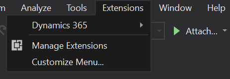 The Dynamics 365 menu that is used by x++ developers has been moved under Extensions menu: